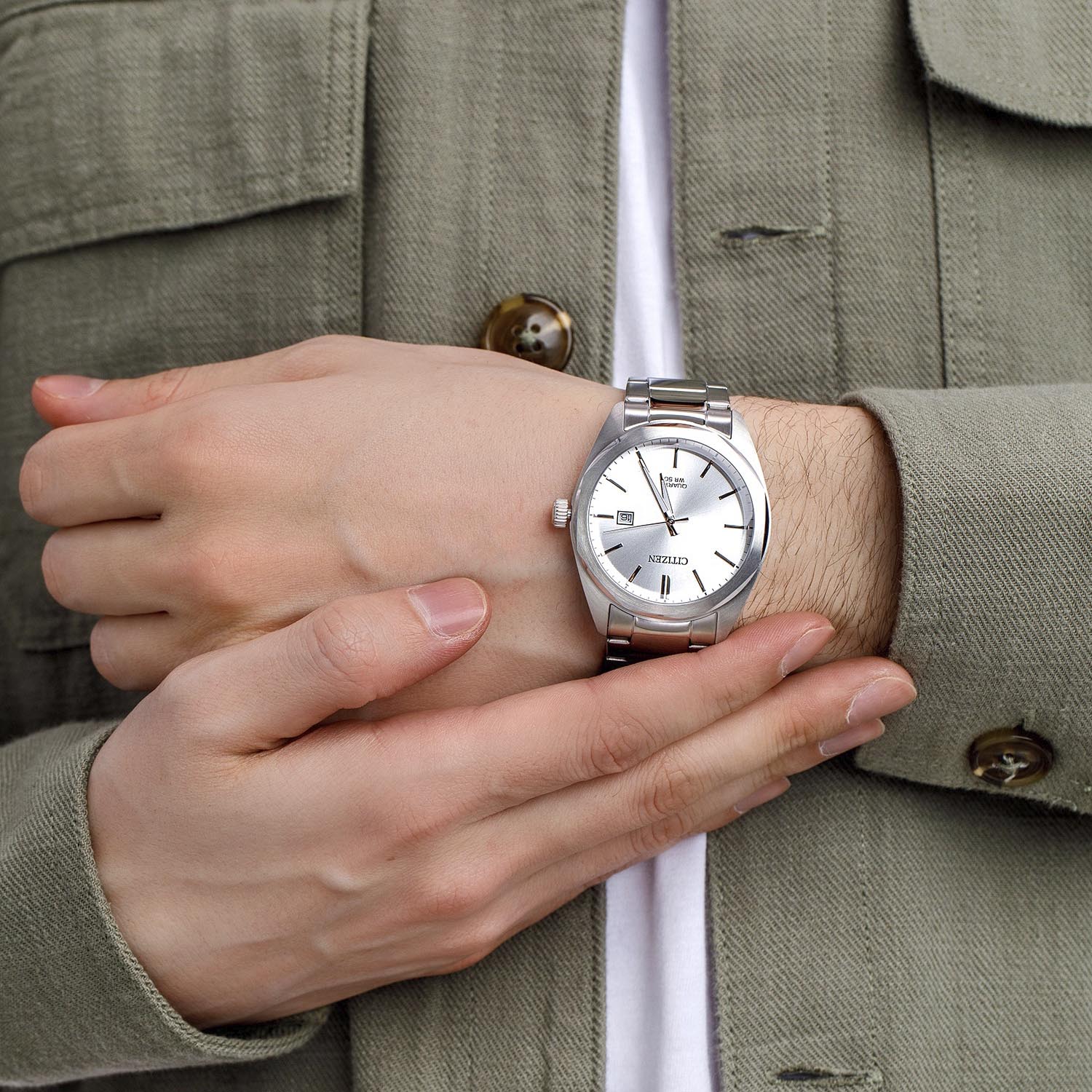 Корпус і браслет з нержавіючої сталі сріблястого відтінку. Фіксований безель з нержавіючої сталісріблястого кольору. Сріблястий циферблат зі сріблястими стрілками та індексами годин. Хвилинні маркерипо зовнішньому ободу. Тип циферблата: Аналоговий. Люмінесцентні стрілки. Індикатор дати в положенні «3години». Механізм з екологічним приводом Citizen Caliber E111-COM. Мінеральне скло, стійке до подряпин.Суцільна задня кришка корпусу. Восьмикутна форма корпусу, розмір корпусу: 41 мм, товщина корпусу: 9,7мм. Ширина ремінця: 22 мм. Розкладається за допомогою застібки з кнопкою. Водонепроникність до 100метрів / 330 футів. Функції: дата, година, хвилина, секунда. Повсякденний стиль годинника. Етикеткагодинника: Японія Movt.